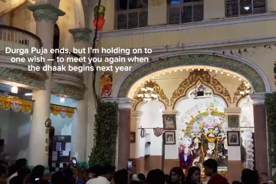 Digital creator Debasmita Ghosh shared a black-and-white clip of Maa’s arati with the caption, “Pujo ashche bhab tai bhalo. Dekhte dekhte shesh pujo (It’s better when Pujo is round the corner. Once it begins it ends too soon)”. The video evokes devotion as well as nostalgia, as we wait with eager hearts for maa’s homecoming next year.