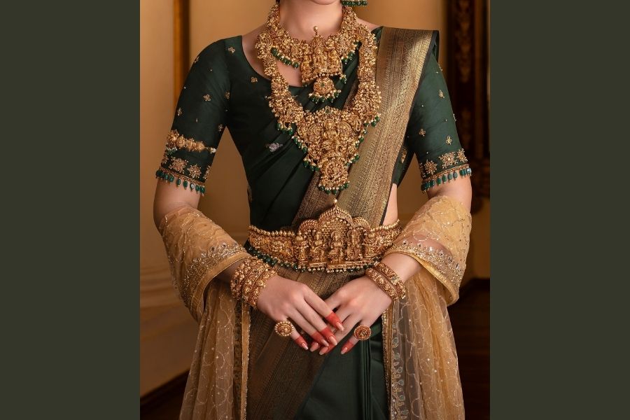 When the neck is heavily layered, the earrings should be equally grand. A large jhumka or a chandelier earring will perfectly balance the look.