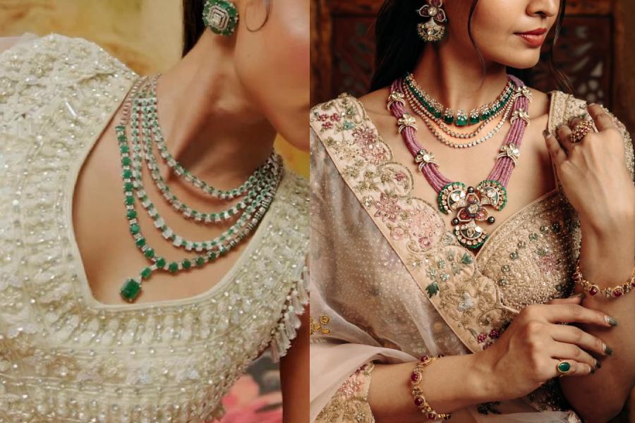 Thoughtful contrasts, like combining kundan with polki or diamonds with coloured stones, ensure each piece stands out while still creating a cohesive, elevated ensemble.