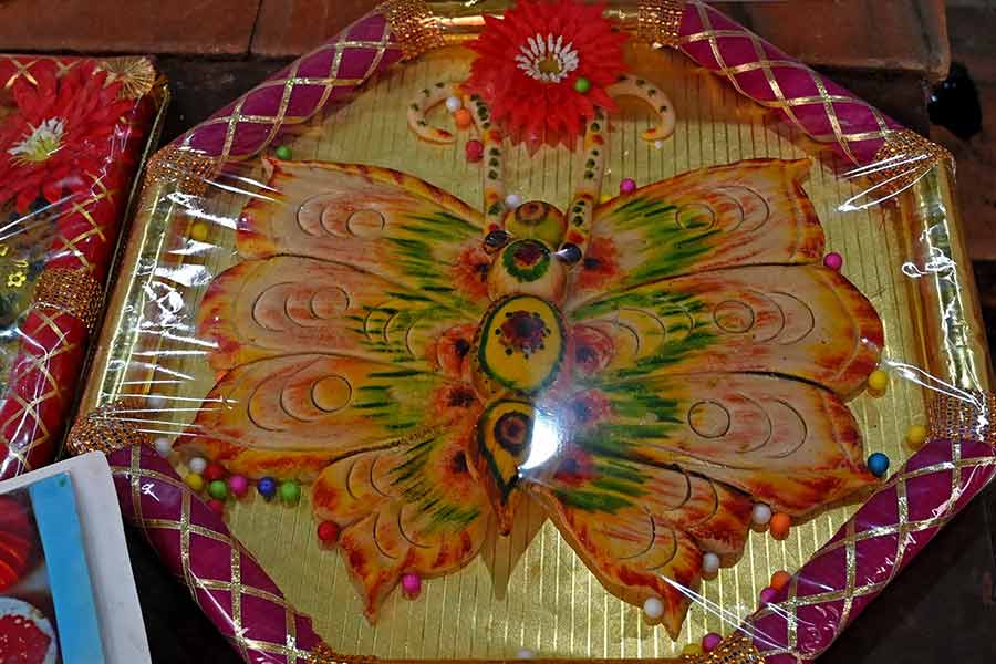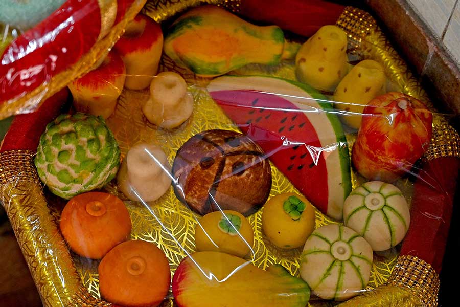 There are about seven to eight shops inside Nutan Bazar that make these models, customised on order. On display were trays filled with miniature fruits and vegetables moulded from khoya. There were mangoes blushed with red, pale green gourds etched with delicate lines, custard apples, bananas and watermelons sliced open to reveal seeds painted by hand. These were arranged on ornate totto thalas lined with gold paper and wrapped carefully in plastic, ready to be sent to the bride’s or groom’s home as part of the ceremonial exchange.