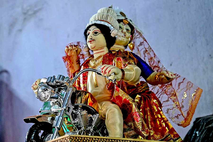 Perhaps the most striking were the figurative pieces. One display showed a bride and groom sculpted in khoya, dressed in red and gold, seated on a motorcycle. The detailing was meticulous, from the groom’s dhoti and the bride’s veil to the chrome finish of the bike. These modern interpretations are increasingly popular among families looking to personalise their totto while keeping its core ritual intact.