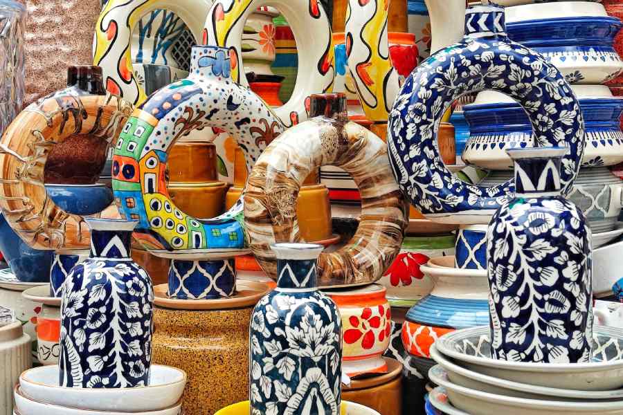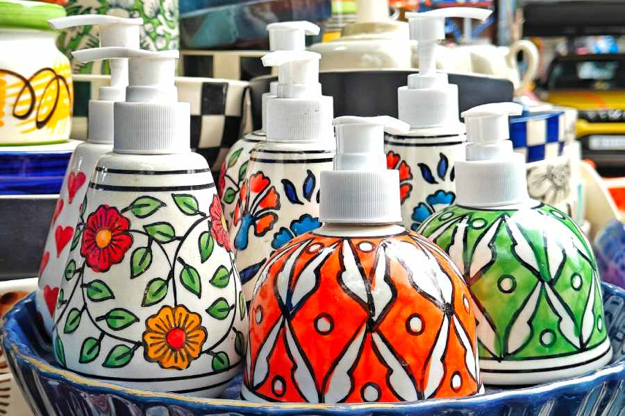Beyond the OG ceramic items, Kolkata’s ceramic markets also offer a varied range of creations that turn every day special. Think quirky-looking salt shakers, pastel-hued bottles for liquid soap, whimsical wall hangings, spoon rests, tiny trinket dishes that keep a home and its people together, but in style! Sprinkling salt on dal or washing hands after dusting your rooms is even more fun.