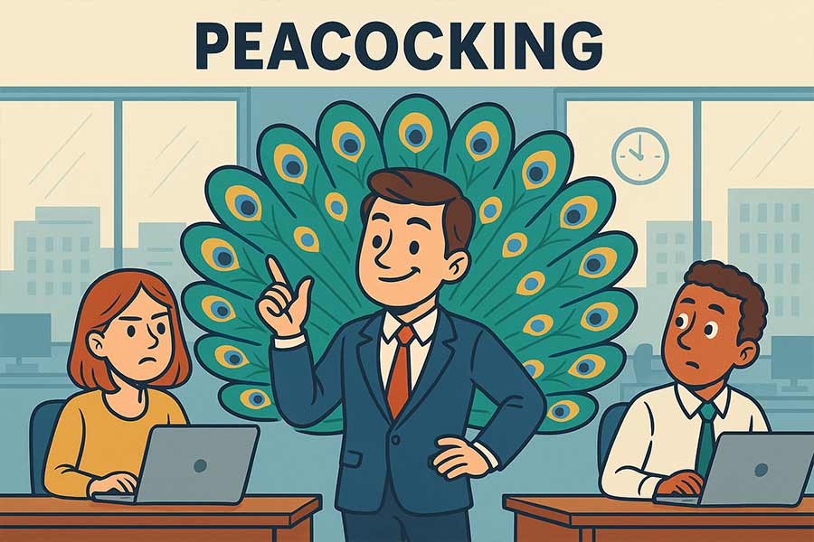 We all know that one colleague who struts into meetings with a PowerPoint that has too many transitions, a blazer with shoulder pads wide enough to land a plane, and the loudest laugh in the room. That’s peacocking: making sure everyone notices you, even if your ideas are bland.