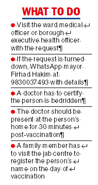 The mayor’s WhatsApp number is 9830037493. A family who wants a bedridden member to be vaccinated at home should provide a certificate from a doctor stating that the person is bedridden and cannot visit a clinic for the jab. Some other documents, like an identity card, have to be submitted, too.