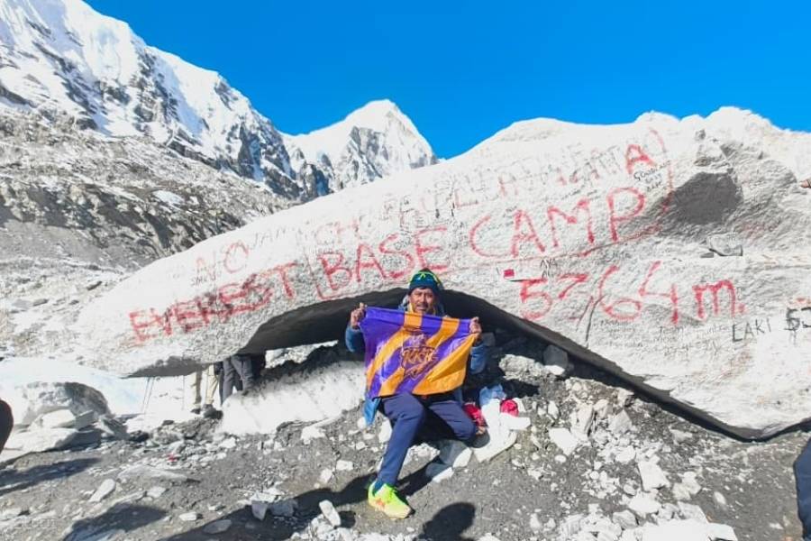 When Ashok Chakraborty finally stood at the base of the world’s highest mountain, the words “Knight Riders family knows no bounds” felt less like a slogan and more like destiny fulfilled. On 19 October, Ashok reached the fabled Everest Base Camp carrying both the Kolkata Knight Riders flag and the Indian Tricolour — his heartfelt tribute to the purple and gold army he has followed with unshakable devotion.