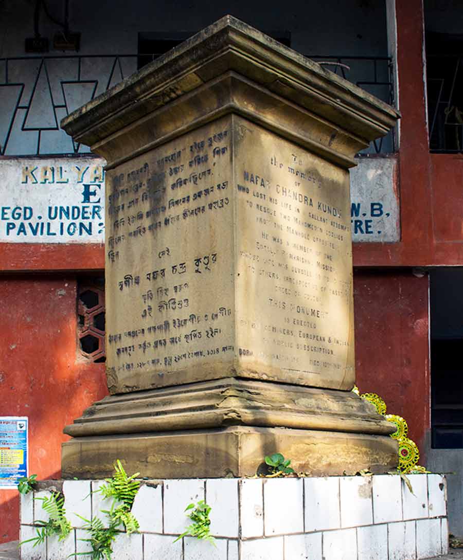 A memorial was erected by his Indian and European friends, which was funded by public subscription (picture above shows upper part of the memorial with the English & Bengali inscriptions). The memorial comprises a square base fitted with glazed tiles (probably added later). It is topped with another structure with a square base placed diagonally with the base. The front two sides of the upper structure contain two memorial plaques in Bengali and English.