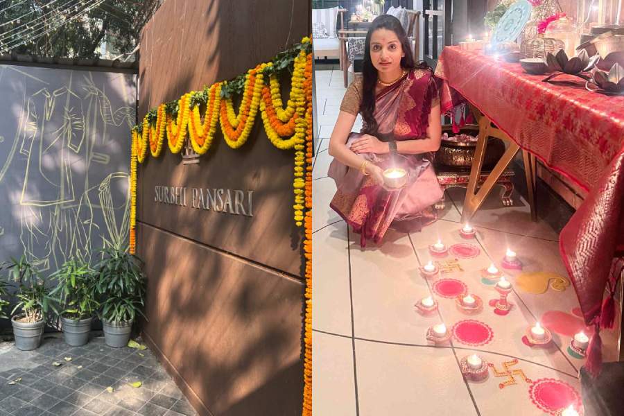 Designer Surbhi Pansari embraces a warm, traditional aesthetic for Diwali, decorating her Ballygunge home with earthen diyas and fresh flowers. Pansari said that she puts up the festive decor at least four days ahead of Diwali. “It helps me to set up the festive ambience at home. It lifts up everyone’s mood and the whole house feels so vibrant,” she said.