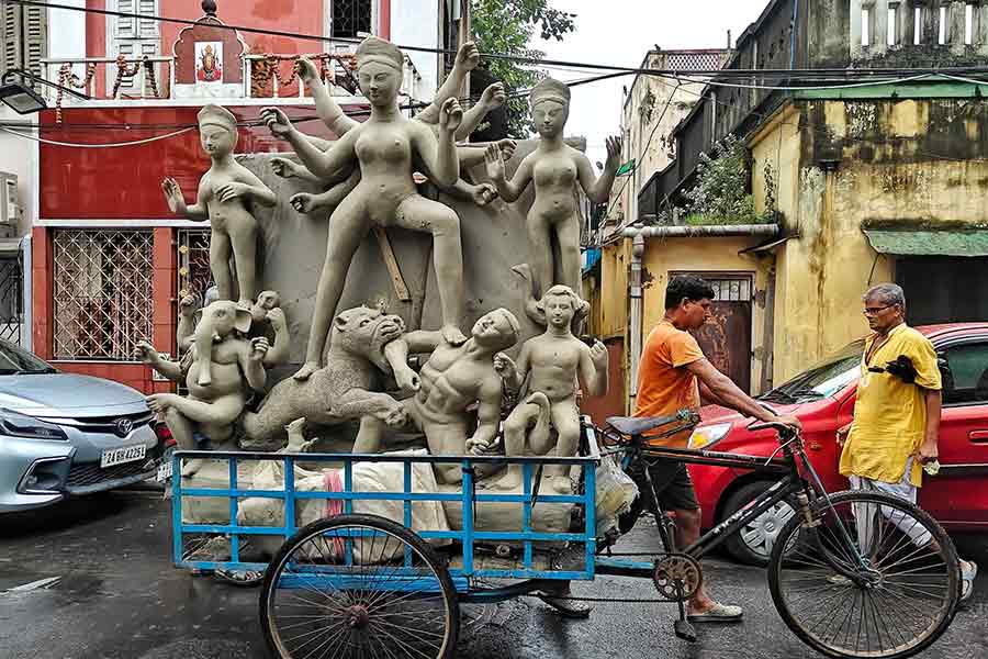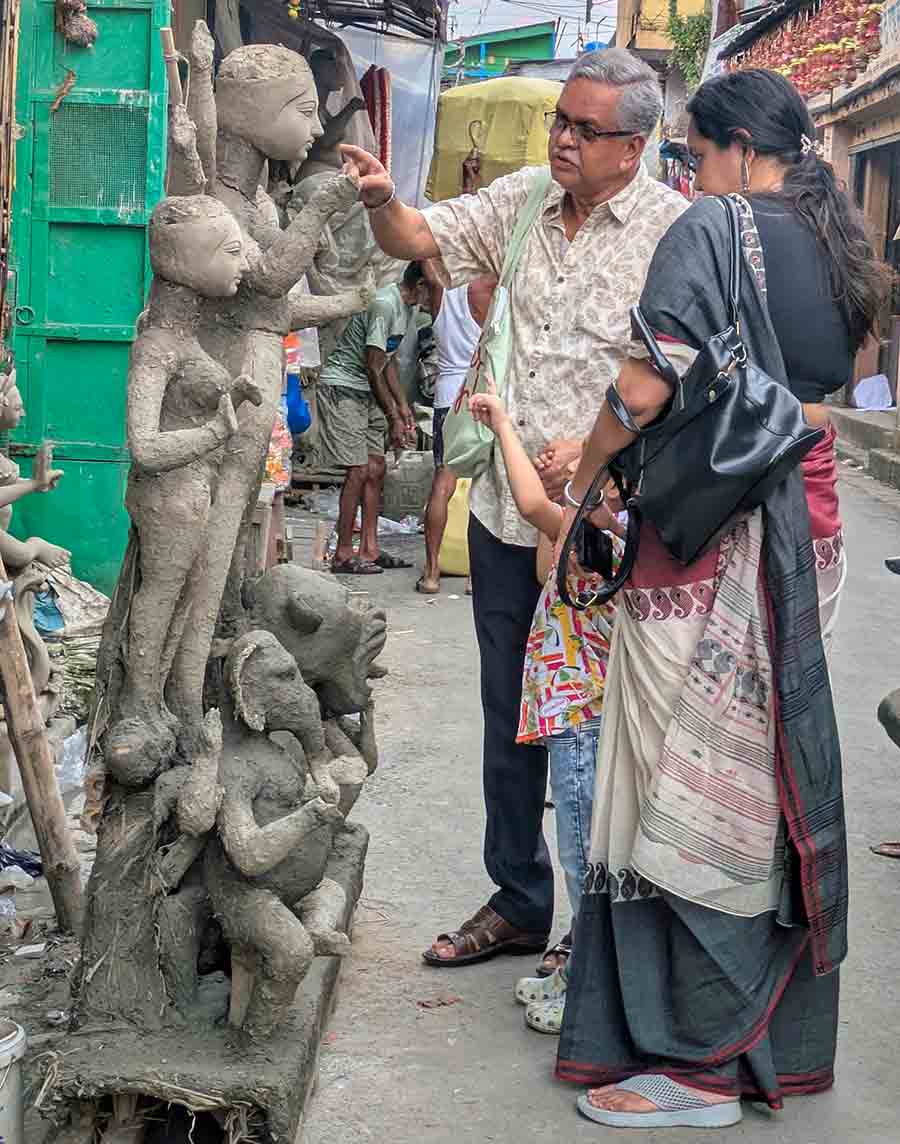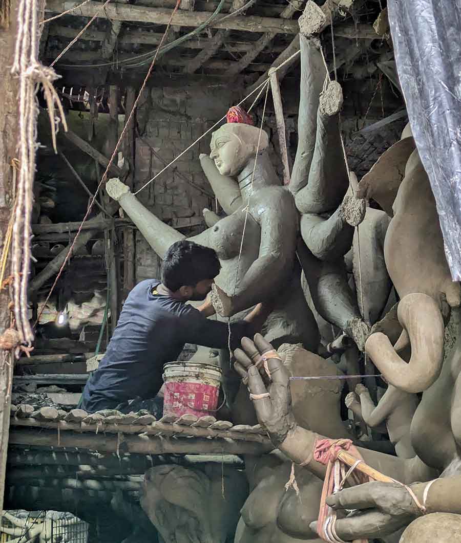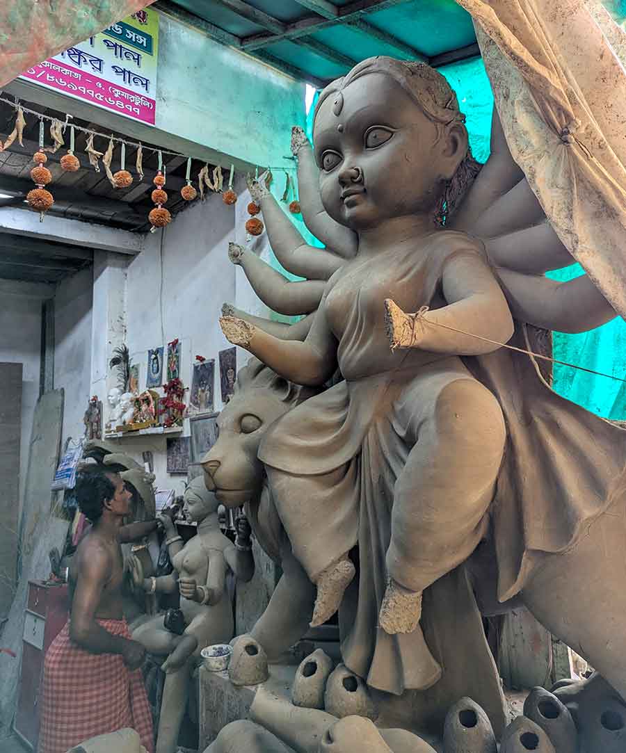 Inside workshops, craftsmen work quietly, some crafting the lion and Mahishasura, while others carve the features of the goddess. Outside, half-made idols are carried on handcarts through narrow streets, drawing curious glances from people passing by.