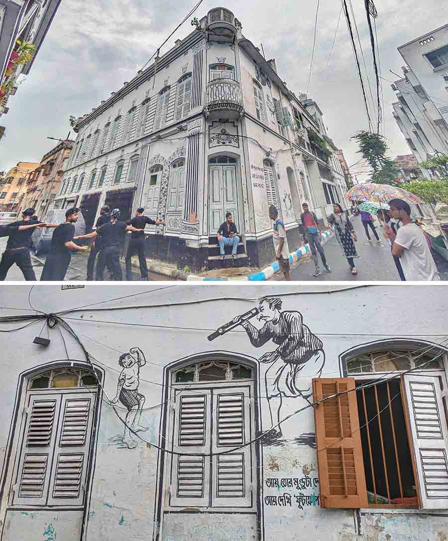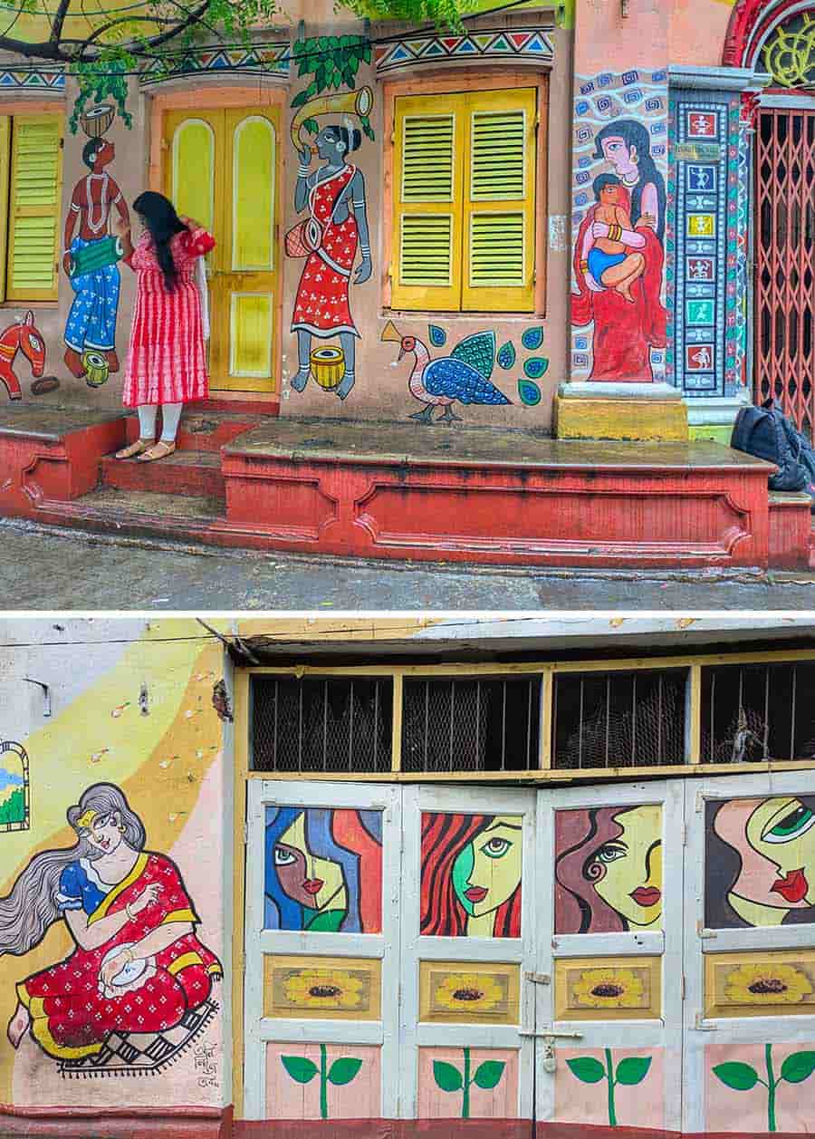 Abol Tabol Para in north Kolkata is a whimsical tribute to Sukumar Ray’s iconic nonsense verse. Located along Nalin Sarkar Street (and its narrow bylane off Aurobindo Sarani), near Hatibagan, this lane was the theme of the Nabin Pally Durga Puja in 2023. Buildings were painted white, outlined in black, and adorned with characters like Ramgorurer Chhana, Hnukumukho Hyangla, Kumro Potash, and Tyansh Goru. It has now turned into an aesthetic spot for photoshoots.