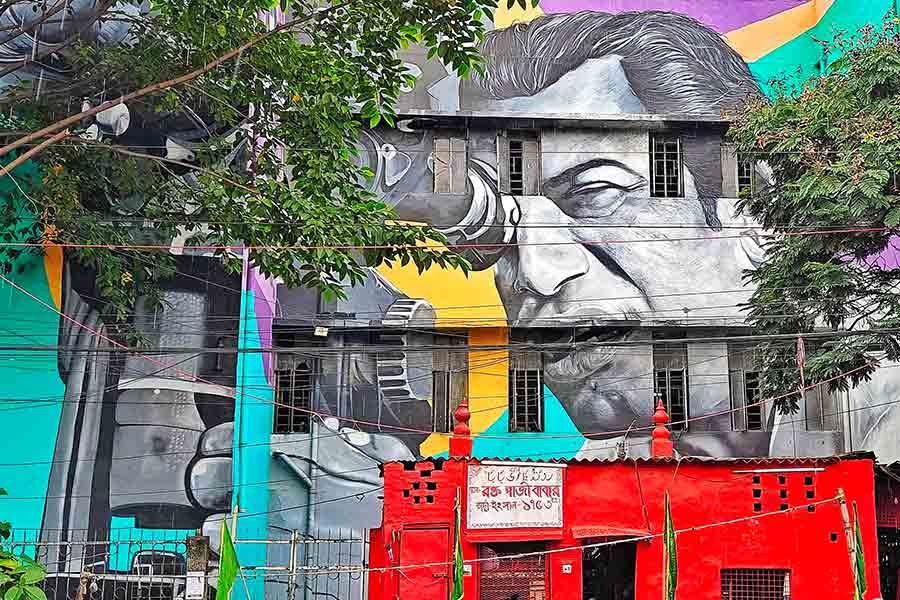 A 3D mural of Satyajit Ray adorns the wall of a Metro Railway building in the Charu Market area, near Rabindra Sarobar Metro station. The mural can be a perfect background for long shots and photos to depict the cinematic essence of the city.