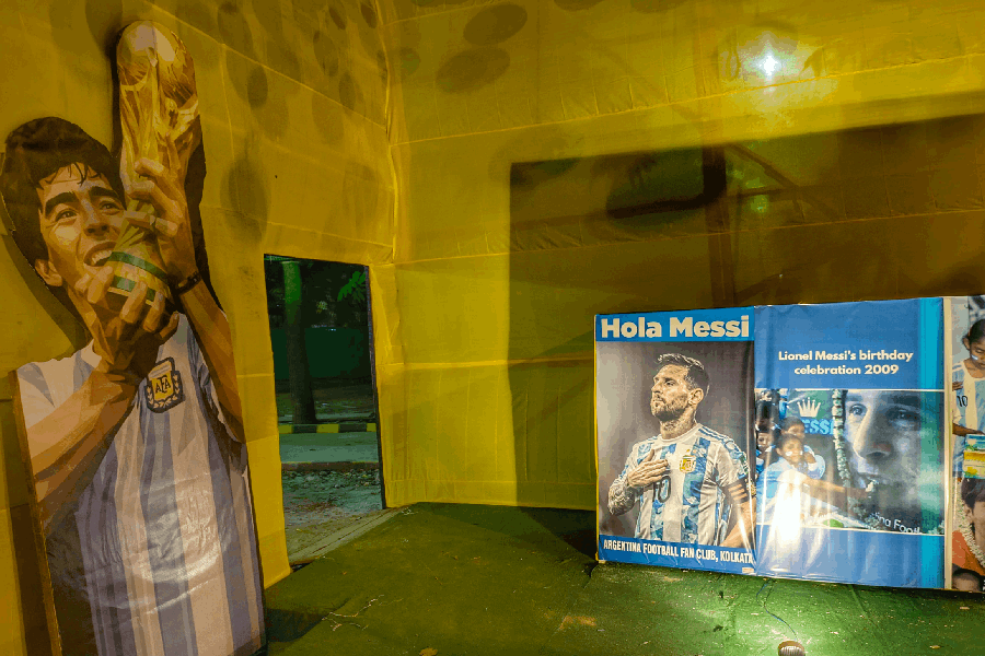 A cut-out of Maradona lifting the World Cup and banners of Messi reminds visitors of the love that the Argentina Football Fans Club of Kolkata has for both the legends.