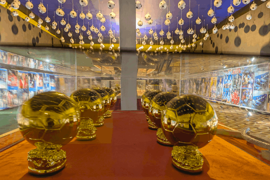 A glittering hall lined with golden Ballon d’Or replicas celebrates Messi’s record-breaking run.