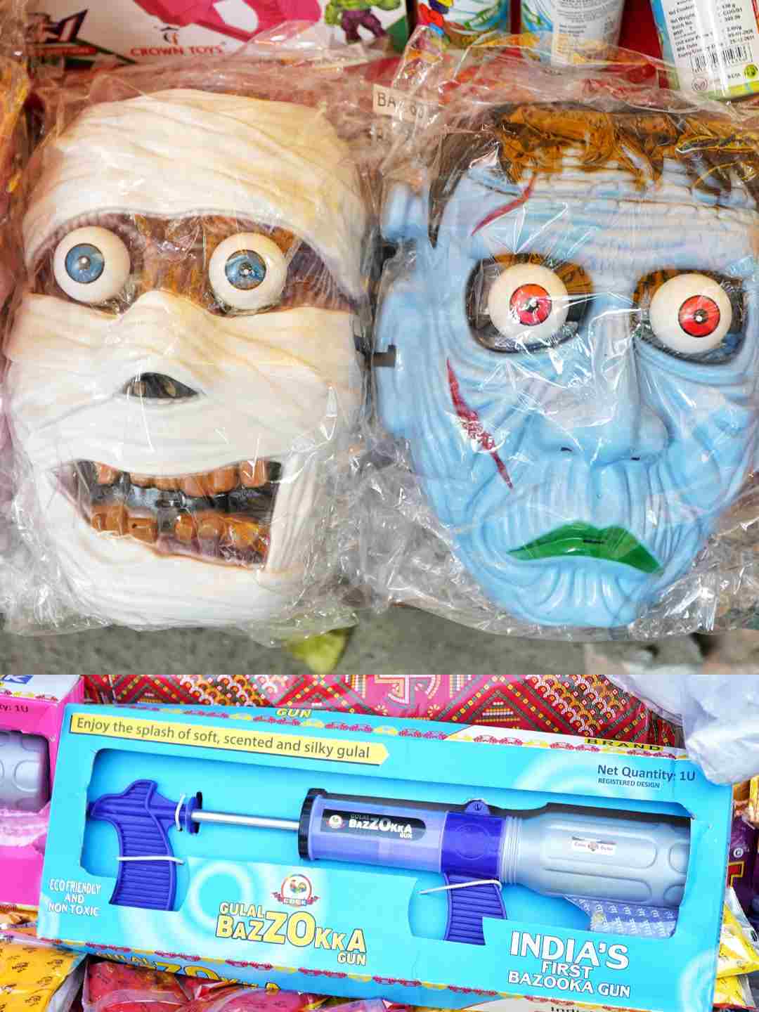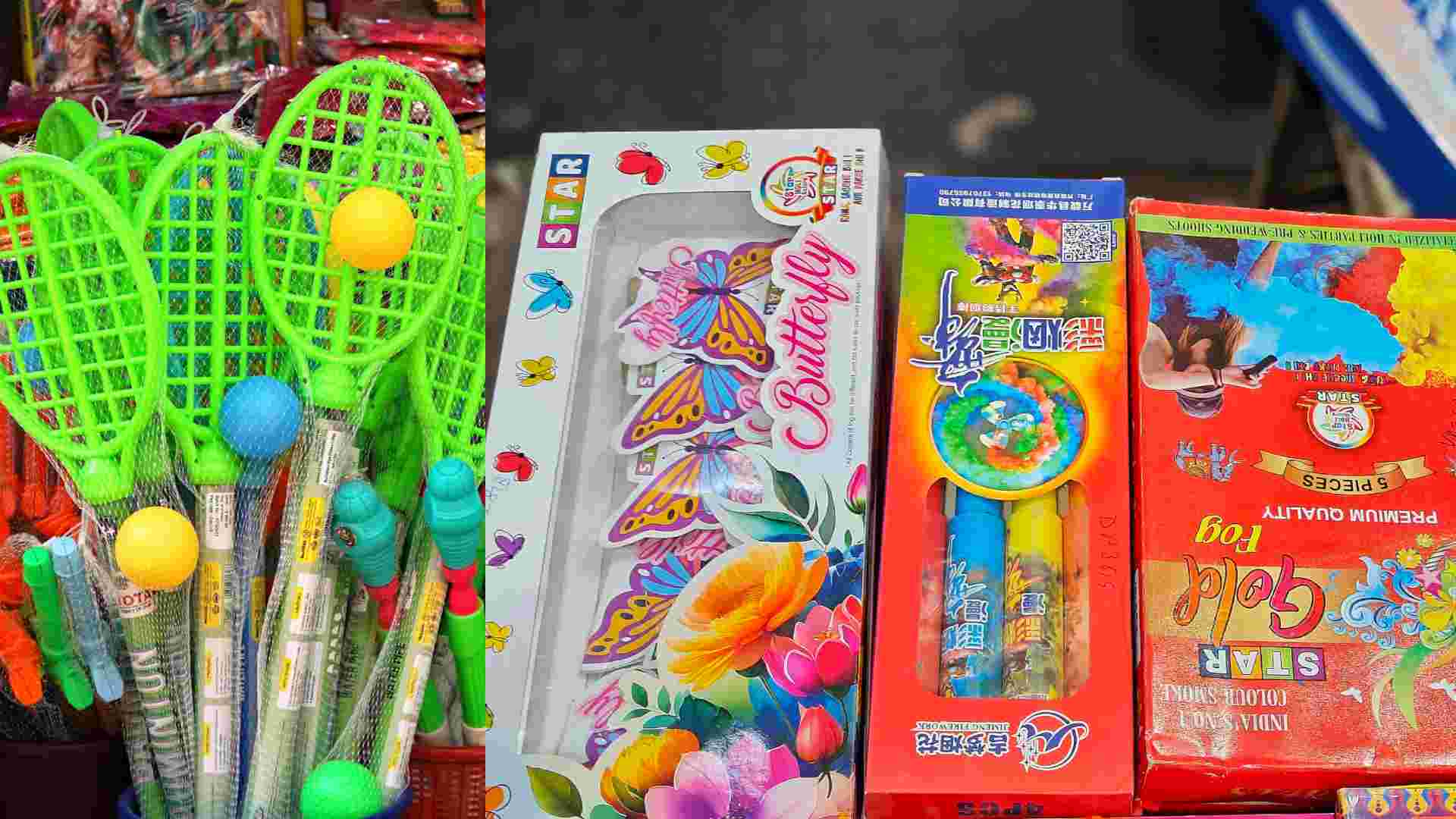 From colourful flare sticks to badminton racket-shaped pichkaris, the market offers a quirky collection of festive goodies that go far beyond the usual picks.