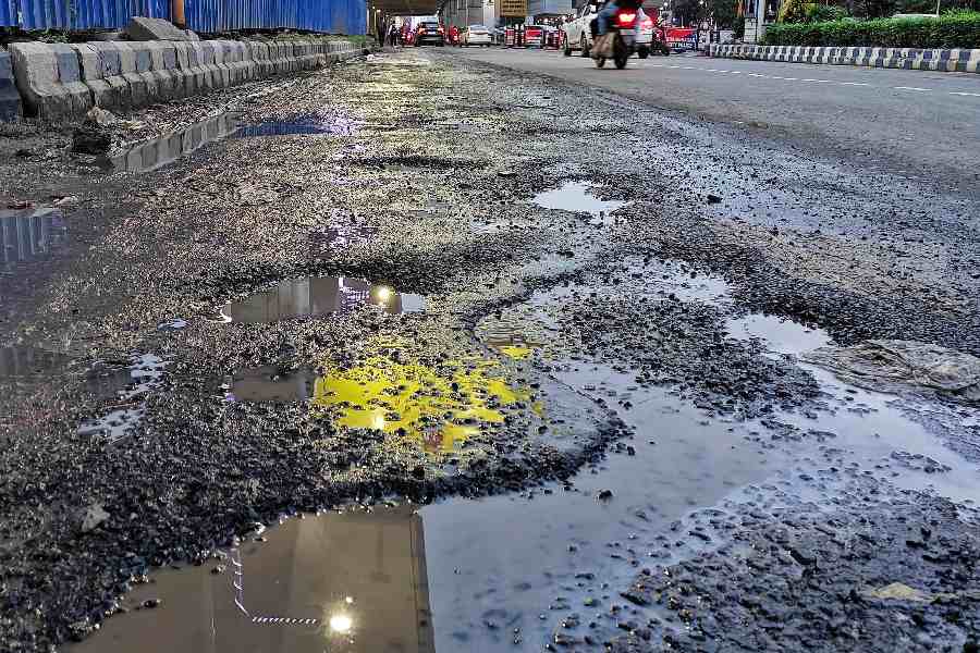 To understand how bad the route has become, we rode from Ecospace in New Town to Dhalai Bridge in Garia. We left at 5.30pm, hitting Biswa Bangla Gate at 5.50pm. The road was already pockmarked with potholes, but the worst lay ahead. Between Biswa Bangla Gate and Nabadiganta Flyover, both the service and main roads were riddled with craters, forcing vehicles to slow to a crawl.