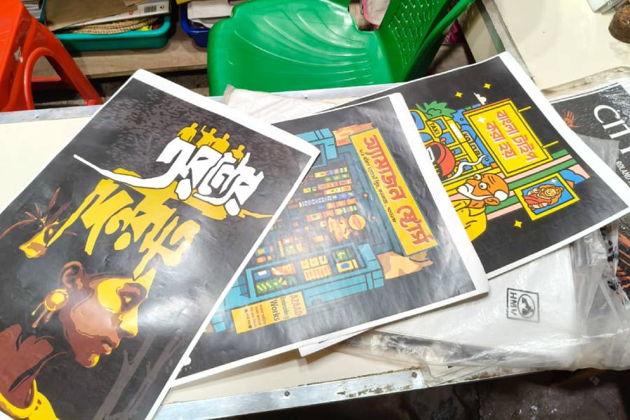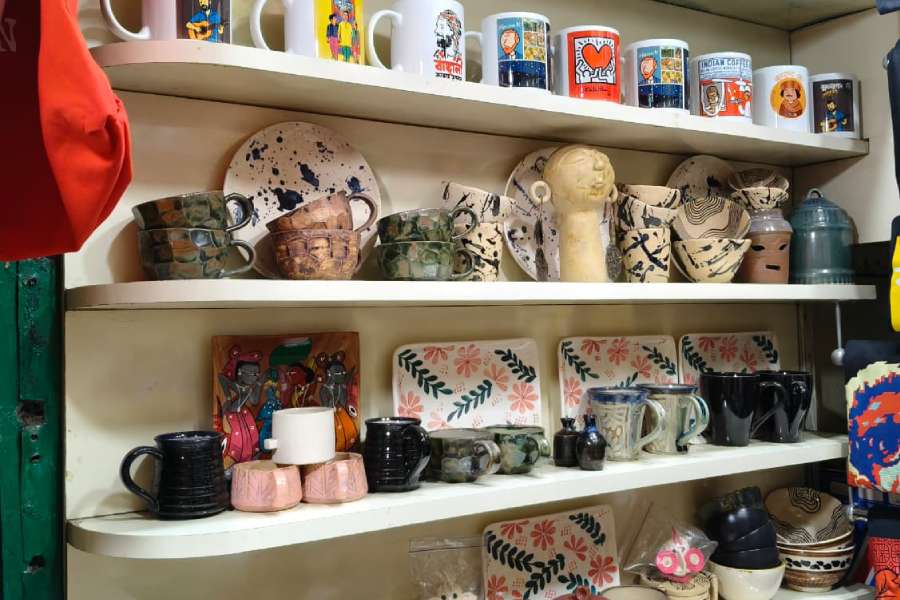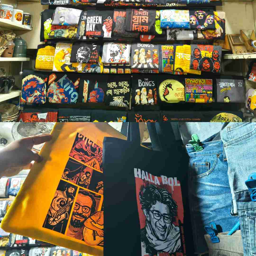 T-shirts printed with images of Fossils, Mohiner Ghoraguli, Ritwik Ghatak, Satyajit Ray and lines from Rabindranath Tagore’s songs are hard to miss. T-shirts themed on Kolkata markets are also available. The printed tote bags, too, feel personal, each one carrying a fragment of who you are.