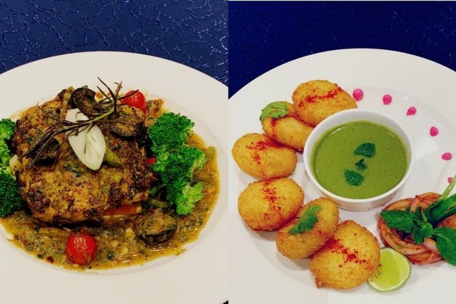Non-vegetarian options include grilled prawns with parsley butter, Thai-spiced