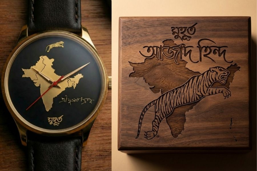 wooden box for the watch. The Azad Hind edition is positioned as both a