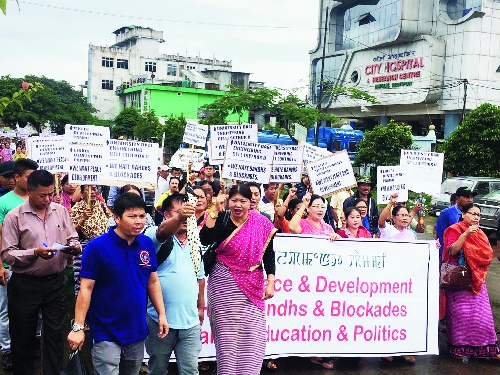 S. Tondang, a participant in a rally in Imphal East, said: "We and like-minded people gathered to take up this peace rally against bandhs, blockades and strikes. The Manipur University should be reopened immediately. The vice-chancellor-in-charge should start functioning without delay. Save the lives of students. The issue should not be politicised. The teachers who do not want to educate students must be removed."
