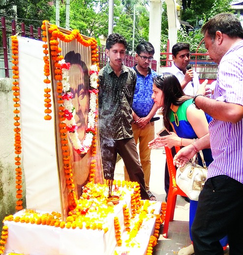 Members of AGP offer tribute to cultural icon Bishnu Prasad Rabha on Rabha Divas in Guwahati on Tuesday. Picture by UB Photos