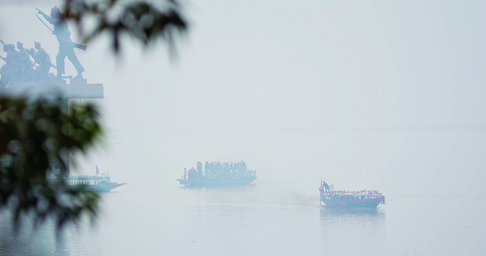 Boats ferry passengers across the Brahmaputra on a foggy morning in Guwahati on Tuesday. Picture by UB Photos