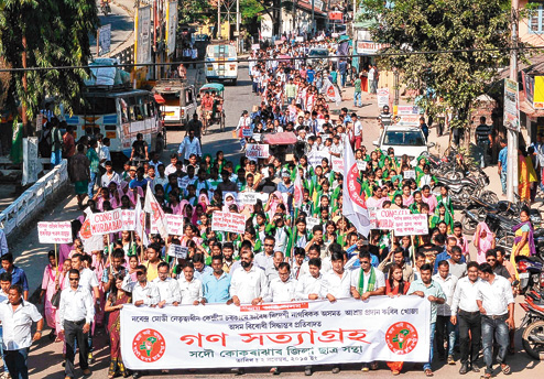 The students' union today carried out a gana satyagraha rally in Kokrajhar against the Centre's notification allowing non-Muslims who migrated from Bangladesh to stay in India without valid documents. Hundreds of people, including students, participated in the rally.