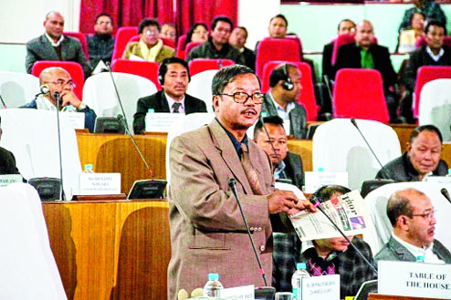 | Opposition leader Donkupar Roy and (right) deputy chief minister R.C. Laloo in the Assembly on Thursday. Pictures by UB Photos |