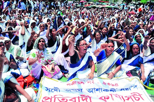 Thousands of ASHAs from different parts of the state gathered at Dighalipukhuri, throwing traffic in and around the area out of gear.