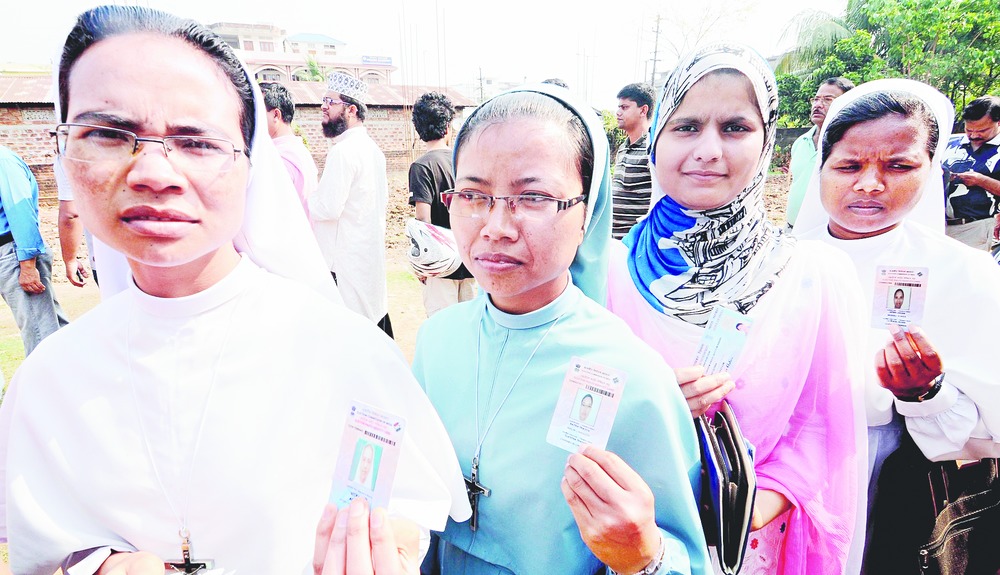 Women show their ID cards before voting in Guwahati on Monday. Picture by UB Photos