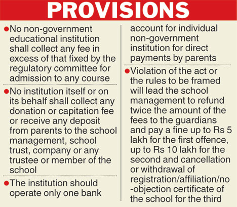 The first bill proposes that the fee regulation committee will recommend maximum limits of fees to be charged by different categories of non-government educational institutions every year before the start of the academic session.