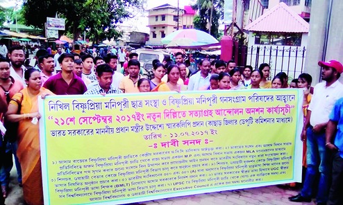 Members of the Bishnupriya Manipuri community protest in Silchar. File picture