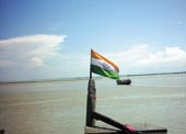 | The Tricolour flutters on a boat plying on the Brahmaputra in Assam’s Dhubri district, bordering Bangladesh, on Tuesday. The authorities have asked boatmen to sport the national flag in a bid to prevent Bangladeshi vessels from straying into the Indian side of the riverine border. (PTI) |