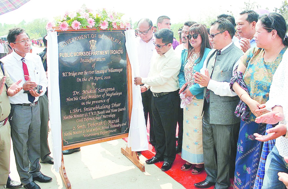 Williamnagar, April 4: It was a moment of joy and celebration as a bridge, under construction for more than 30 years, was inaugurated today by Meghalaya chief minister Mukul Sangma, in the presence of social welfare minister Deborah Marak and PWD minister S. Dhar here.