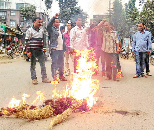 | AJYCP activists burn the effigy of state power minister Pradyut Bordoloi in Tinsukia on Saturday. Picture by UB Photos |