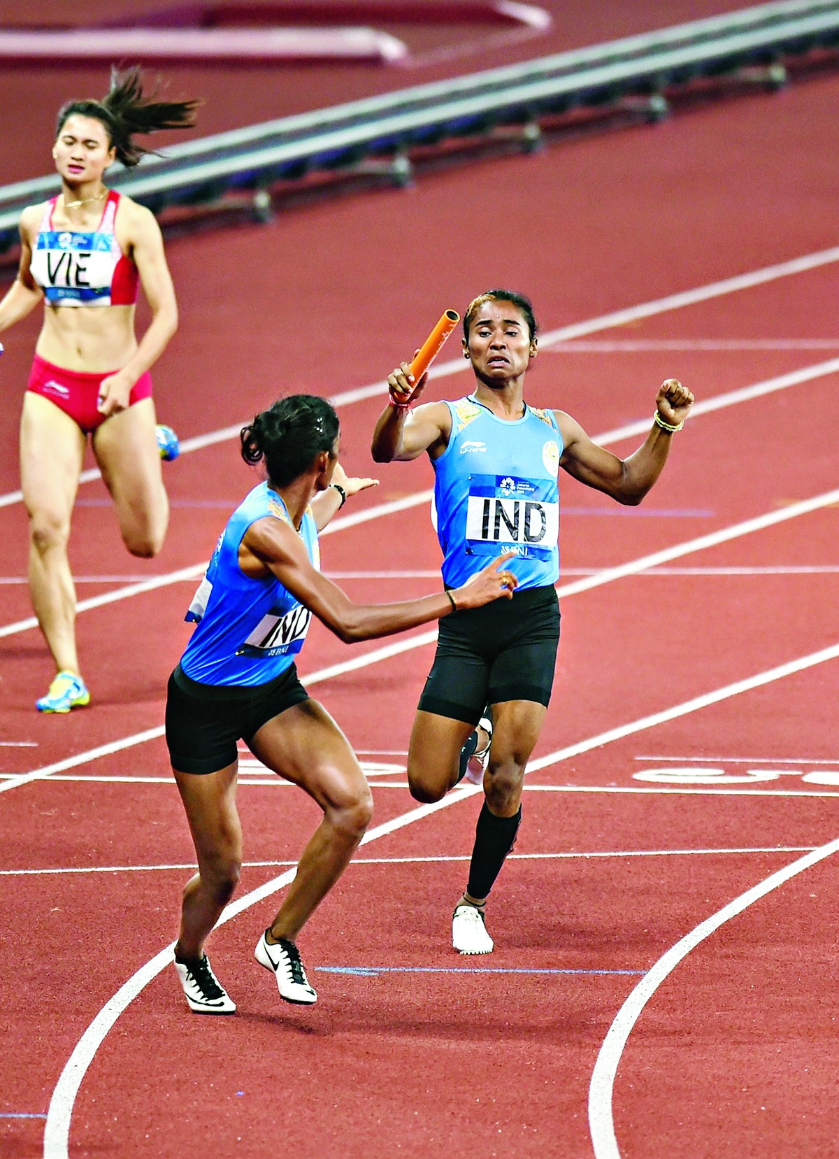 Hima teamed with Poovamma Raju, Saritaben Gayakwad and Vismaya V. Koroth to bag the women's 4x400m relay gold, clocking 3:28.72 minutes - a little over two seconds ahead of the Bahrain quartet that comprised Salwa Naser against whom Hima missed the women's 400m gold.