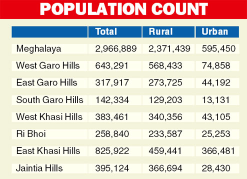 On the other hand, marginal workers (who worked for less than six months) have marginally increased, with the exception of urban areas. In 2001, the percentage was 22, while in 2011 it was 22.3 per cent. Meghalaya’s overall population stands at 29,66,889, with 14,91,832 men and 14,75,057 women. Out of the total population, 23,71,439 live in 6,839 villages, while 5,95,450 live in urban centres.