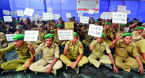 Guwahati, Aug. 9: A group of special police officers (SPOs), under the banner of Assam Special Police Officers Welfare Society, staged a protest at Dighalipukhuri today against their dismissal and demanded appointment in the new third Assam Industrial Security Force (AISF) battalion.