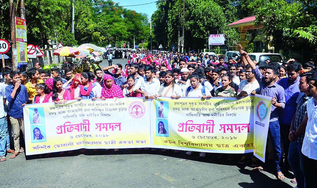 Cotton University students and teachers paid tributes to Ankita Baruah and Dimpi Bora, students of the university, who died in the accident. Students staged protest outside the Kamrup (metro) deputy commissioner's office and blocked the arterial MG Road. They demanded bus services from Cotton University to North Guwahati.