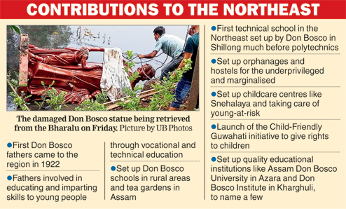 Guwahati, Aug. 7: The statue of priest and educator John Bosco (Don Bosco) that was to be unveiled by Assam chief minister Tarun Gogoi at Bharalumukh riverfront, was partially damaged and pushed into the Bharalu by over 100 people at 6 this morning.