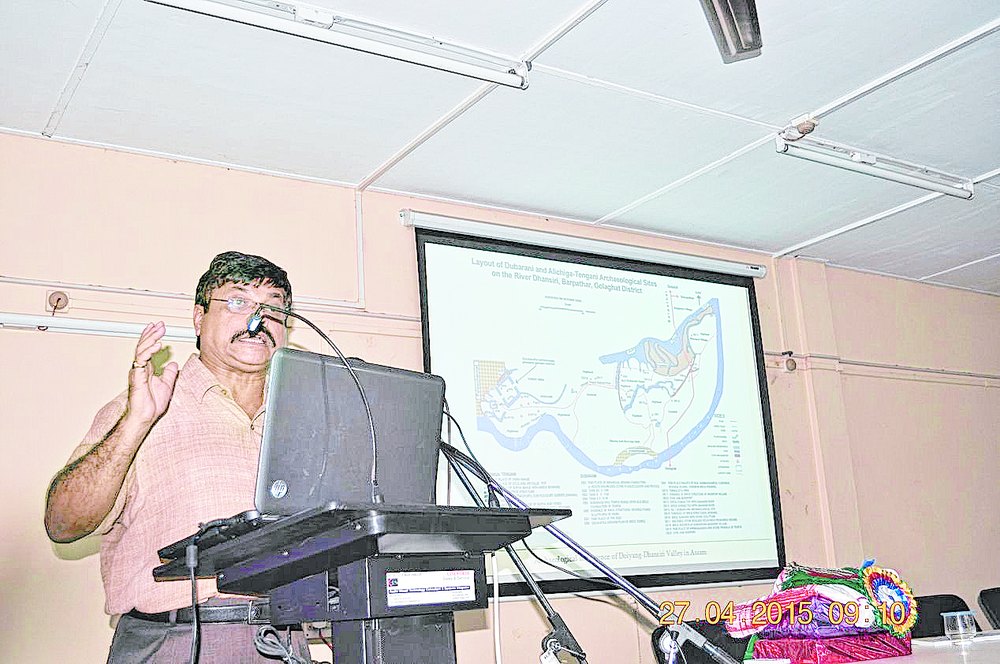 He also presented a documentary on the excavations of the archaeological ruins led by him at Dubarani, Barpathar in the valley in which a clay seal inscribed in the Brahmi script had referred to a king Vasundhara Varman. Also, the site had yielded the imprint of two feet on terracotta which was most likely of a king who was worshipped. The plinth of a temple found in the area made of bricks was also in the Vastu Shastra mode, all speaking of a highly civilised people.