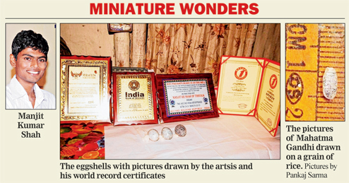 Manjit Kumar Shah, who hails from Makum in Upper Assam's Tinsukia district, will stake claim to a new record for drawing 12 miniature images of Mahatma Gandhi on a single grain of rice.