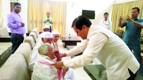 Assam chief minister Sarbananda Sonowal felicitates Assam freedom fighters Motram Hatimuria of Charaideo district, Narendra Nath Haloi of Nalbari , Golok Hazarika and Nirmala Goswami of Lakhimpur district at Assam Bhawan in New Delhi on Friday.