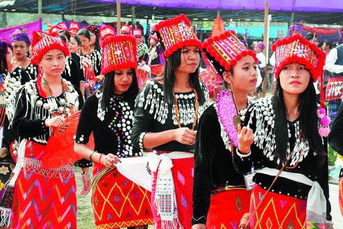 Girls participate in the Shapawang Yawng Manau Poi festival, the annual mega cultural festival of the Singpho tribe, at Namsai in Arunachal Pradesh on Tuesday.