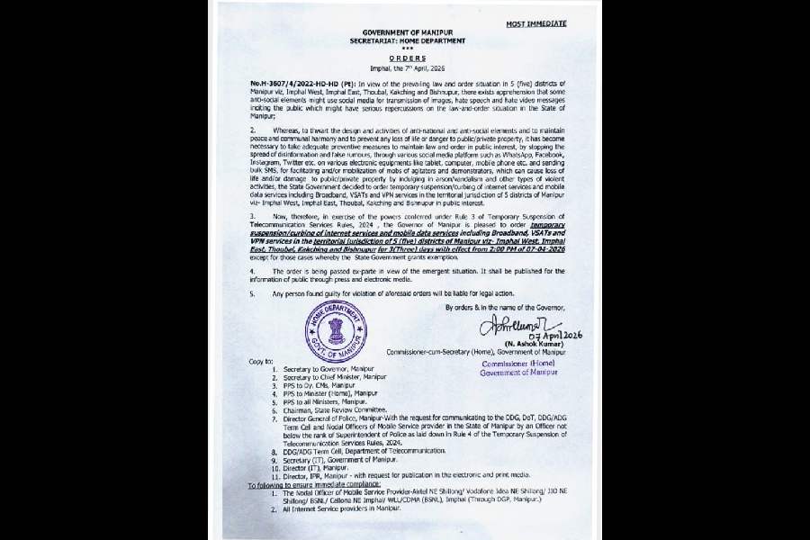 The Manipur government on Tuesday ordered suspension of internet and mobile data services in five districts for three days amid protests over a bomb attack in Manipur’s Bishnupur district on Tuesday, which left two children dead and their mother injured.