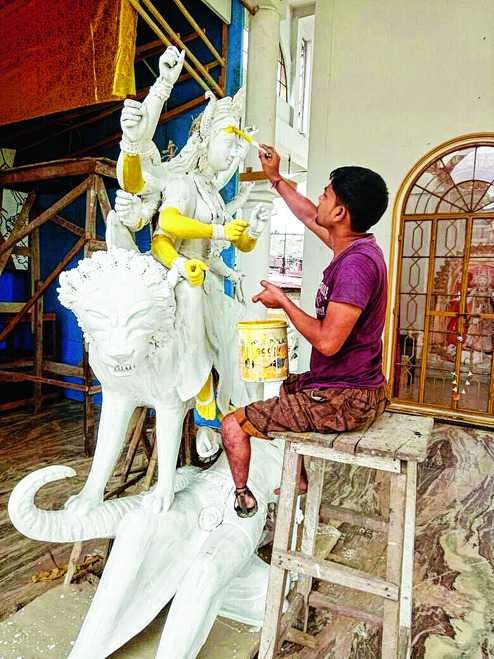 Gobinda Chandra Nath prepares an idol in a pandal in Hailakandi town. Picture by Satananda Bhattacharjee