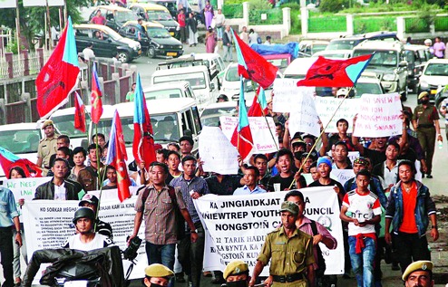 Raising slogans against the Meghalaya government for neglecting the West Khasi Hills district, the activists also asked the government to implement strong laws that can safeguard indigenous Hynñiewtrep people and implement laws like the inner-line permit (ILP) to check influx as they walked on the national highway.