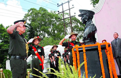 General Commanding Officer of 101 Area, Lt Gen. D.S. Ahuja pays homage to the bust of Kargil martyr and local lad Capt. Keishing Clifford Nongrum on the occasion of Kargil Diwas at Rhino Heritage Museum in Shillong on Wednesday.