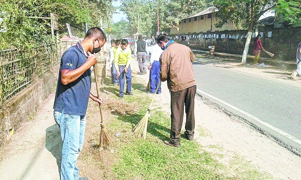 Staff of Jorhat Science Centre and Planetarium clean a stretch of road. Telegraph picture