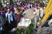 | People gather around the body of ‘Laden’, a rogue elephant killed by forest officials in Behali tea estate in Assam on December 16. (Reuters) |