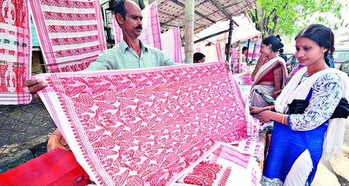 Guwahati, April 11: Weavers from rural Assam are doing brisk business in gamosas in the run-up to the Bihu festivities, following the official ban on the sale of the machine-made varieties purchased from outside the state.