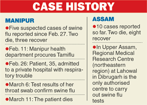 March 11: Manipur's first swine flu patient and another patient with symptoms of the virus, both women, died at a private hospital this morning. In Assam, chief minister Tarun Gogoi directed the state health and family welfare departments to work on a mission mode to contain the spread of the disease.